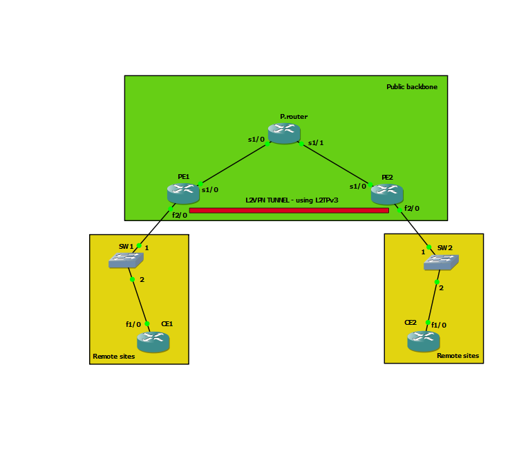 First config - connected 2 sites over public backbone using L2TPv3. Pings CE1 to CE2 successful.